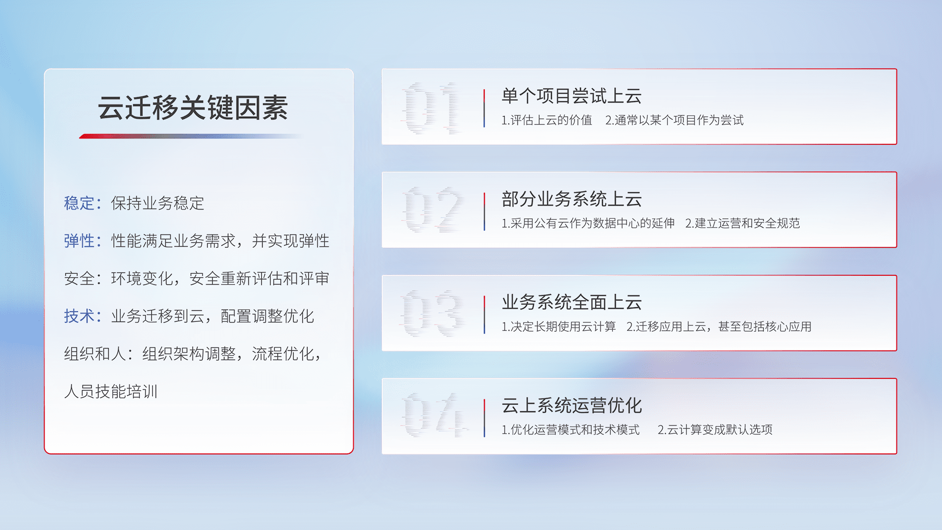结合实际业务,,,,从规划设计、、、、云平台选型、、、云原生改造、、、数据迁移、、集成交付,,迁移全过程为客户识别最佳上云路径,,做好风险识别管理,,,,设计网络架构、、、、身份权限、、、、安全审计合规、、、操作审计、、、、日志审计、、、、监控告警策略、、多站点容灾设计等,,对云上基础设施进行整体规划,,提升IT治理水平,,,以满足弹性、、高可用、、高性能的需求。。