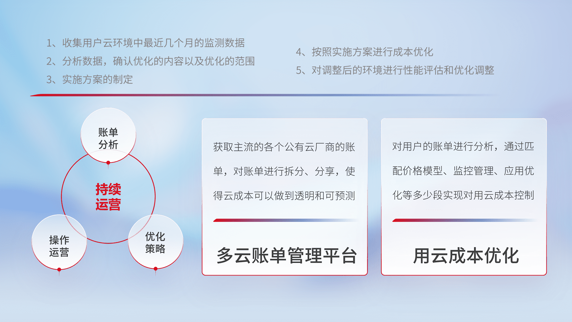 通过多云纳管,,以统一的资源数据模型把客户的云资源进行抽象和封装,,,,进而实现对多云资源的统一操作,,,,保障云资源管理的可靠性、、、稳定性与可用性。。。量身定制化运维内容,,,配置、、开发运维、、、补丁管理、、、、备份、、、、监控、、认证和访问管理、、、审计和日常巡检等,,,,保障在用云过程中的可靠度,,,,稳定度以及高可用率。。