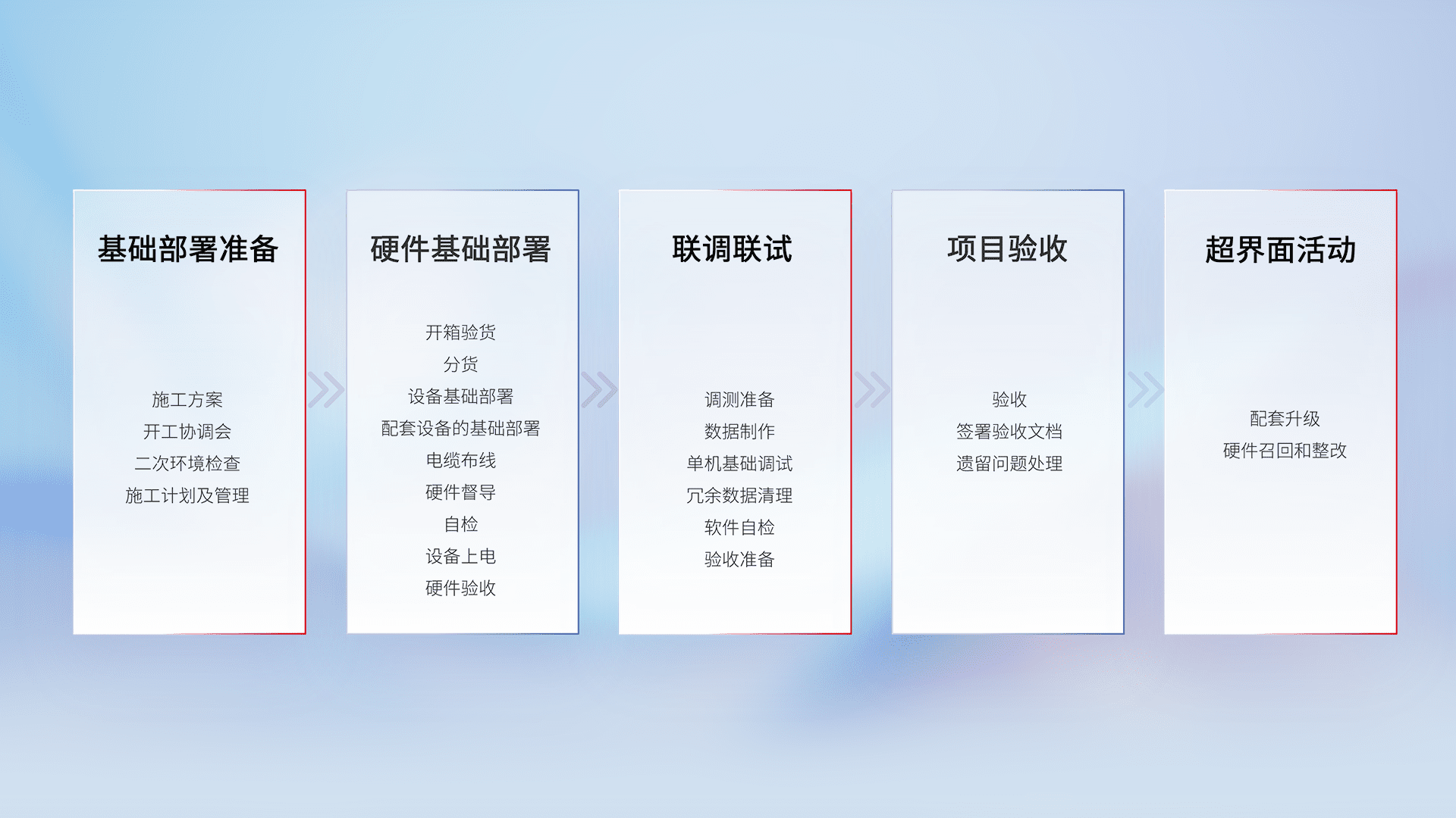 从基础部署准备、、硬件基础部署、、、联调联试、、项目验收、、越界面活动的全过程可追溯,,保证施工质量和进度。。